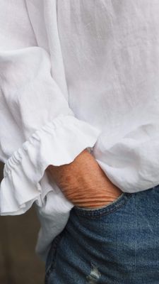 The Akitio Blouse is a new take on a classic, retro-style peasant blouse. Bringing together a mix of elegance and a casual, flowing linen style. Featuring a ruffled collar, a partial button line with fabric-covered buttons, and ruffled sleeves with elastic in the cuff. The ruffled sleeve cuffs can be styled either tucked in or worn out.