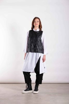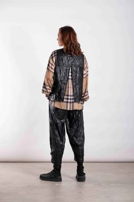 This is a statement womens overtop designed as a lightweight layering piece with strong, architectural lines. Featuring a clean sleeveless shape with a structured body, the Harper Overtop adds definition and edge when worn over shirts, dresses, or knits. Shown here in Liquid Noir, the finish brings depth and contrast to layered looks.