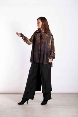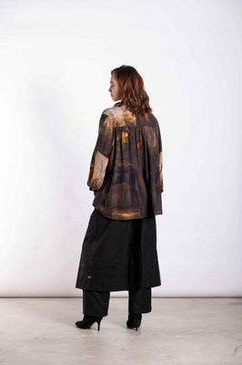 This is a softly structured women’s shirt designed with a relaxed, wearable silhouette and thoughtful tailoring details. Featuring a concealed button-through front and gentle shaping through the back yoke, the Buccaneer Shirt offers comfort and ease while maintaining a clean, refined look. The Midnight Trek print adds depth and storytelling, with subtle horses emerging through the lower body of the print, like shadows moving through the landscape. An original artwork designed by Deeanne Hobbs.