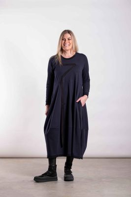 feature detailing. Featuring ribbon detailing through the front rib neckline and cuffs, the Marcia Dress adds a refined point of interest while maintaining a soft, wearable shape that sits comfortably on the body. Shown here in Navy, the colour brings warmth and depth to the Grounded Form palette.